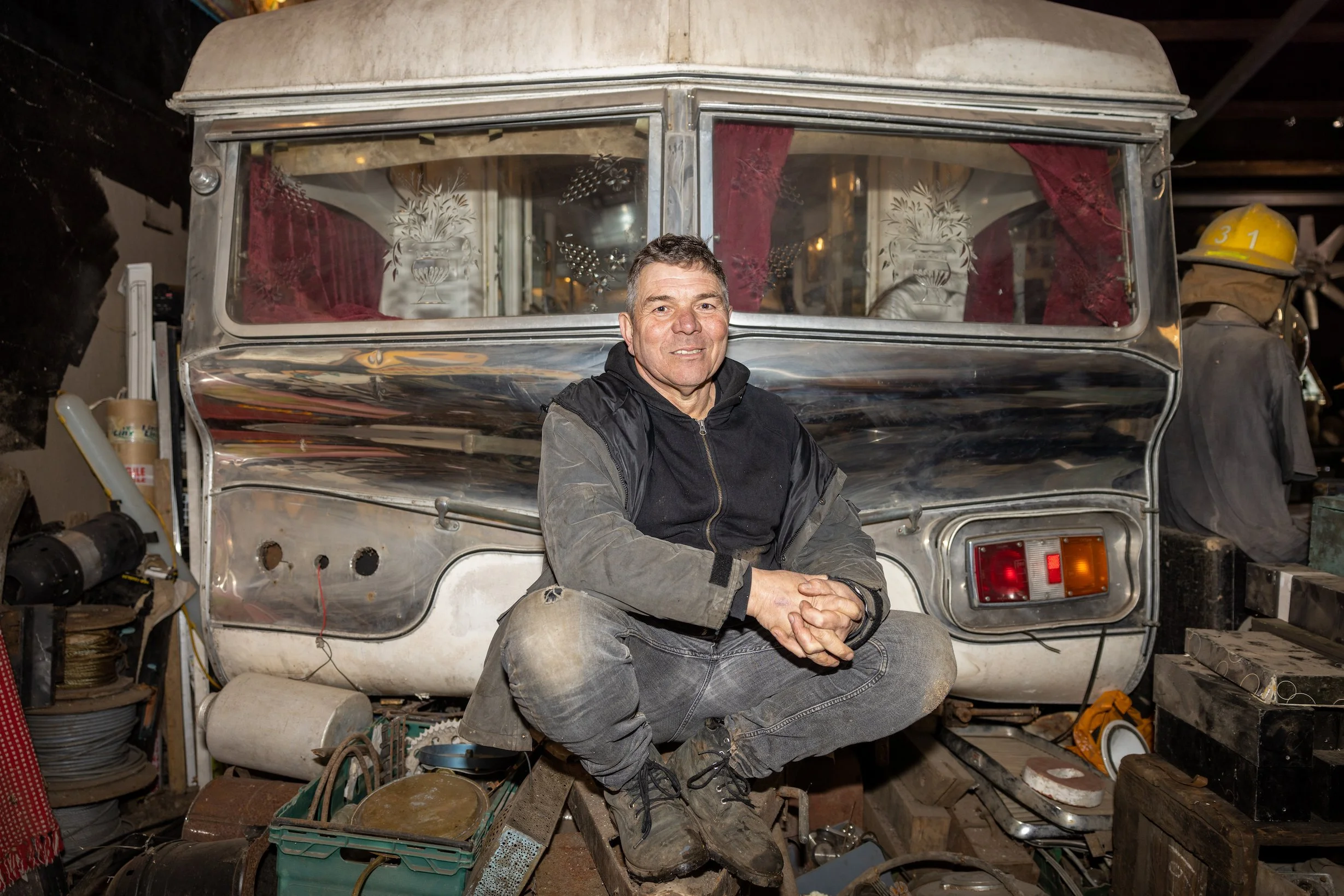 Mark’s ethos are parallel to those historical art movements such as Dada, Situationist, Pop Art, Punk art & Fluxus, in that he doesn’t seek permission and uses what already exists. This rough diamond buried in the Somerset hills survives on good old anarchist principles of solidarity not charity. It’s impossible not to meet Mark when you visit. You’ll usually be greeted by his big beaming smile from the cockpit of his forklift or you’ll hear his unmistakable infectious laughter filling the yard.